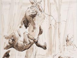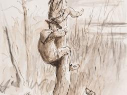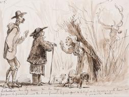 C’est eux-mêmes qui se représentent accrochés et tombés d’un arbre, faisant fuir deux chiens et un cerf, l’air effrayé ! Alors que les animaux ont été dessinés par Rosa Bonheur (ce sont les siens), les personnages sont de Paul Chardin. Le ton humoristique et l’enchaînement des scènes font penser à de la bande dessinée avant l’heure.